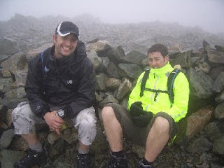 Great view! From Great Gable we descend to Sty Head Pass and then begin our ascent of Lingmell (800m). During a practice ascent at the beginning of May, we came across a rescue in progress. About half way there is a very steep 5m scramble. Someone had fallen from it. A Royal Navy helicopter was in the process of lifting the injured walker. From the top of Lingmell the summit of Scafell Pike (978m) would be easy to see, on a clear day. We couldn't see more than 50 yards however, having covered the same ground in the same conditions a month before, we knew which way to go, at least as far as Broad Crag (930m).